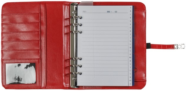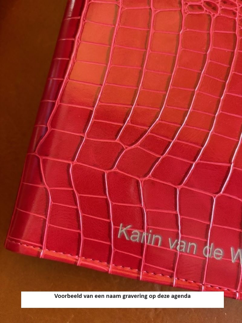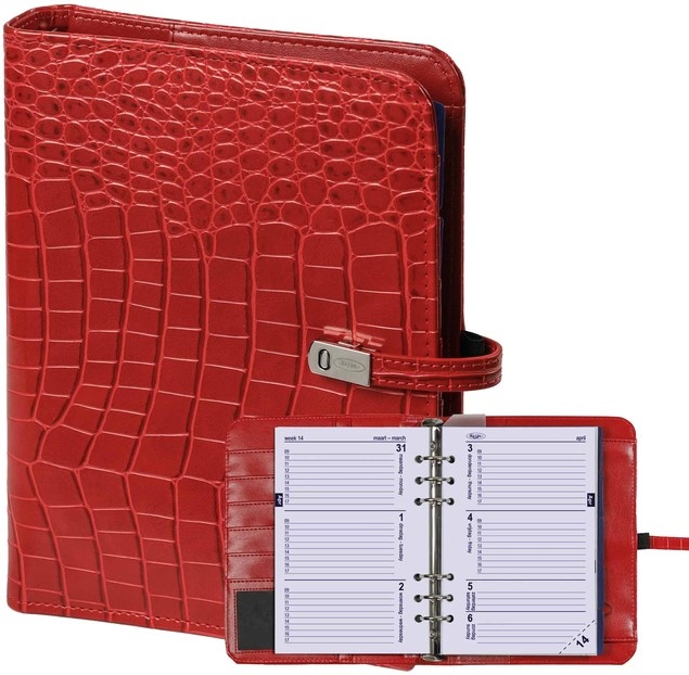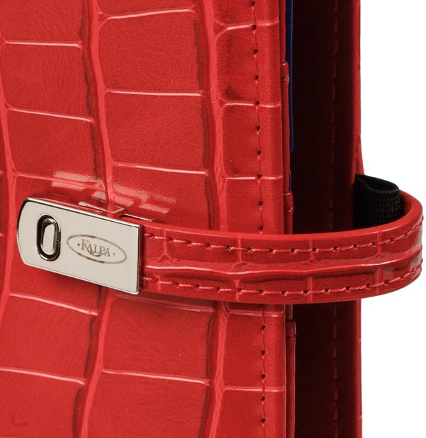 Croco rode en navulbare A5 organizer van Kalpa. Deze organizer heeft een zeer handige indeling ook voor het opbergen van visitekaartjes, creditcards en andere losse documenten. De organizer is af te sluiten met een drukker en wordt geleverd inclusief jaarinhoud 2026 met 1 week op 2 pagina's.