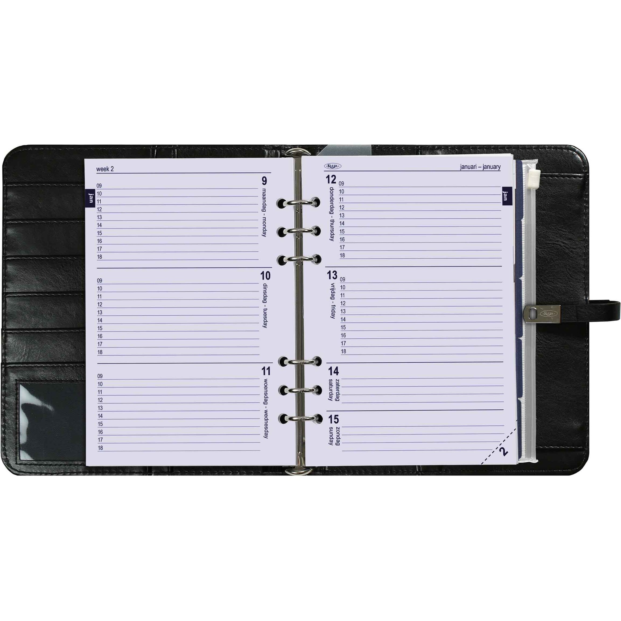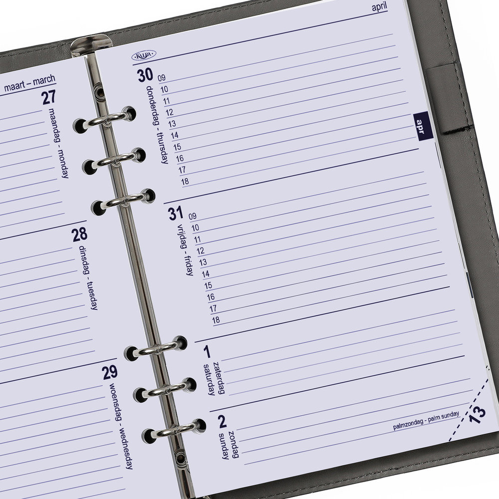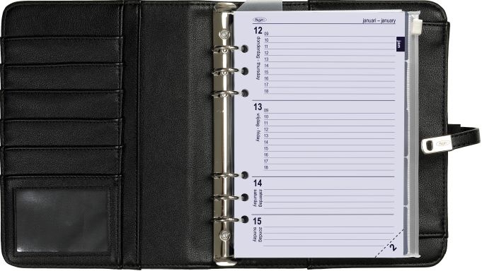 De organizer is voorzien van tabbladen, pagina-scheider, notitieblaadjes en adresboekje. Het calendarium bevat ruimte voor persoonlijke gegevens, kalenders en planners voor lopend- en volgend jaar. De individuele dagen vermelden bovendien veel religieuze en (inter)nationale feest- en herdenkingsdagen.