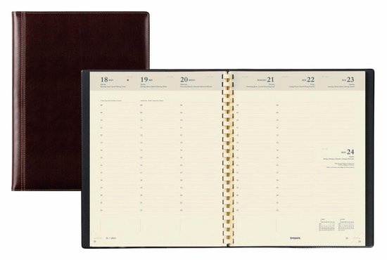Deze handige A4 bureau agenda Concorde van Brepols, is uitgevoerd in een mooie kwaliteit kunstleder uit de serie Palermo. De jaarlijks uitwisselbare inhoud is internationaal te gebruiken en is 6-talig. Deze uitwisselbare jaaragenda (deze is elk jaar los te bestellen) heeft 1 week overzicht op 2 pagina's met een tijdsindeling van 1 regel per uur. Zie detailafbeelding.