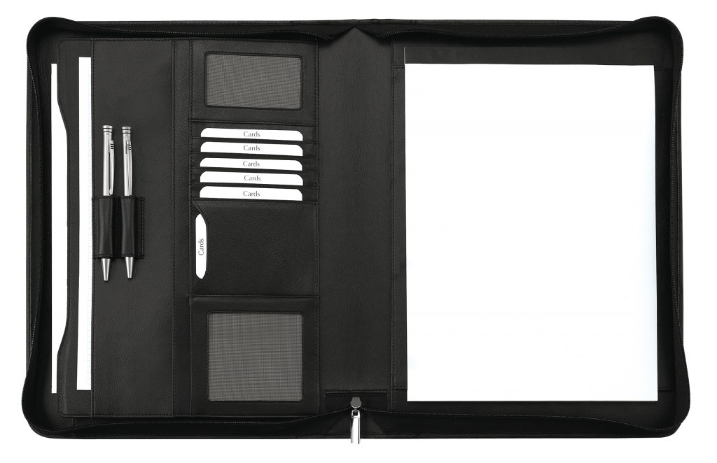 Deze soepele A4 schrijfmap heeft verschillende opbergvakken, 5 insteekvakken voor pasjes, twee zichtvakken voor pasjes of creditcards, 1 medium insteekvak en 1 groot A4 harmonica vak en een foldervak, twee penhouders en een schrijfblok.