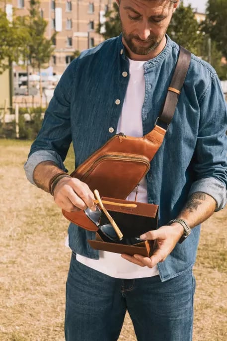 Looking sharp, met deze lederen brillendoos. Minimalistisch design, opvouwbaar en makkelijk weg te stoppen.