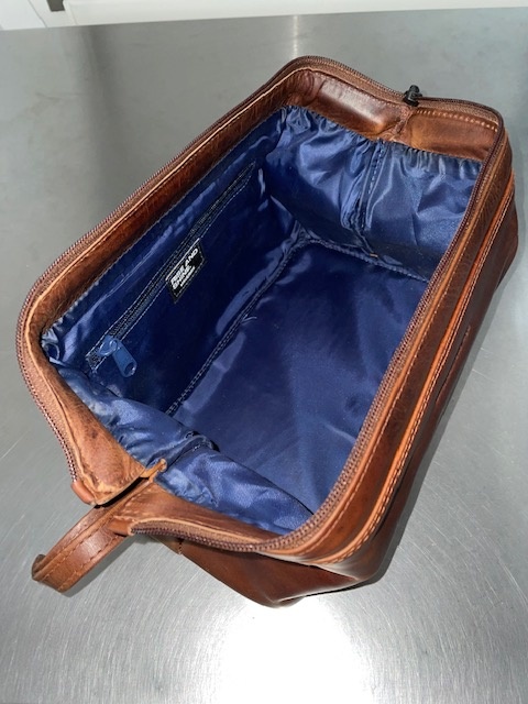 Deze nieuwe en praktische leren toilettas heeft een uniek systeem waardoor deze extra wijd opent. Dit komt door de toepassing van een innovatieve ritssluiting met beugel, vergelijkbaar met de ouderwetse dokterstas. Hierdoor is de toilettas extra overzichtelijk als je hem opent.