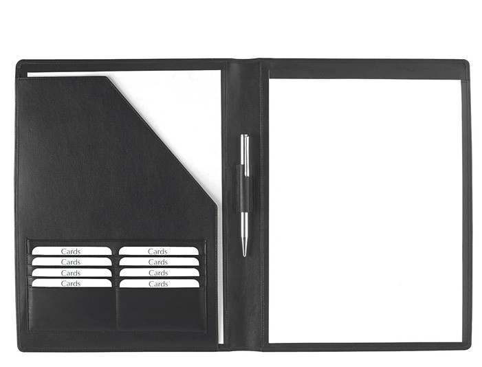 Prachtige schrijfmap A4 van mooi rundleder. Deze map heeft een schrijfblok aan de rechterzijde, een penhouder in het midden en aan de linkerkant 8 insteekvakjes voor uw pasjes of creditcards en een groot insteekvak A4 voor uw documenten.