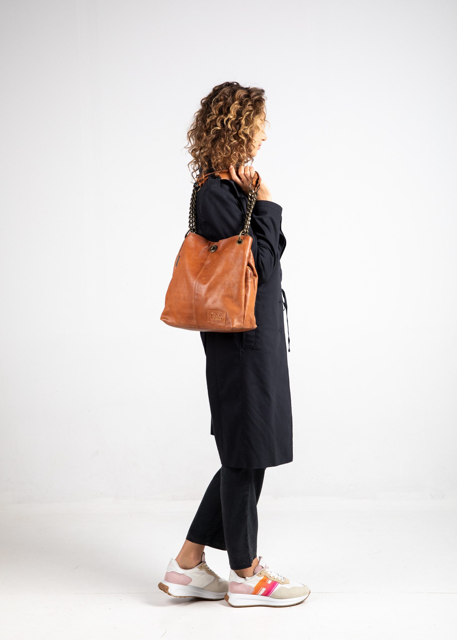 Onze Chain Fashion Bag is onderdeel van de “firm ox bags” serie. Deze schoudertassen kenmerken zich door volnerf: dit is een stevig en tegelijkertijd soepel leer. Onze schoudertassen worden met zorg op een plantaardige manier gelooid en gekleurd, zonder het gebruik van schadelijke stoffen.