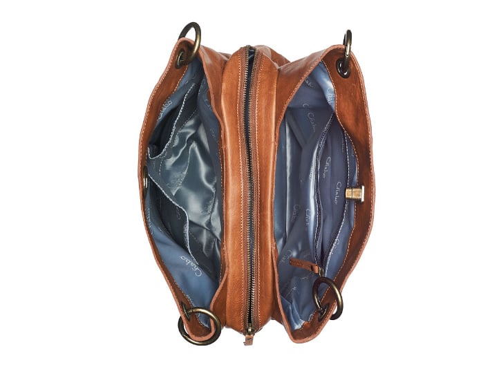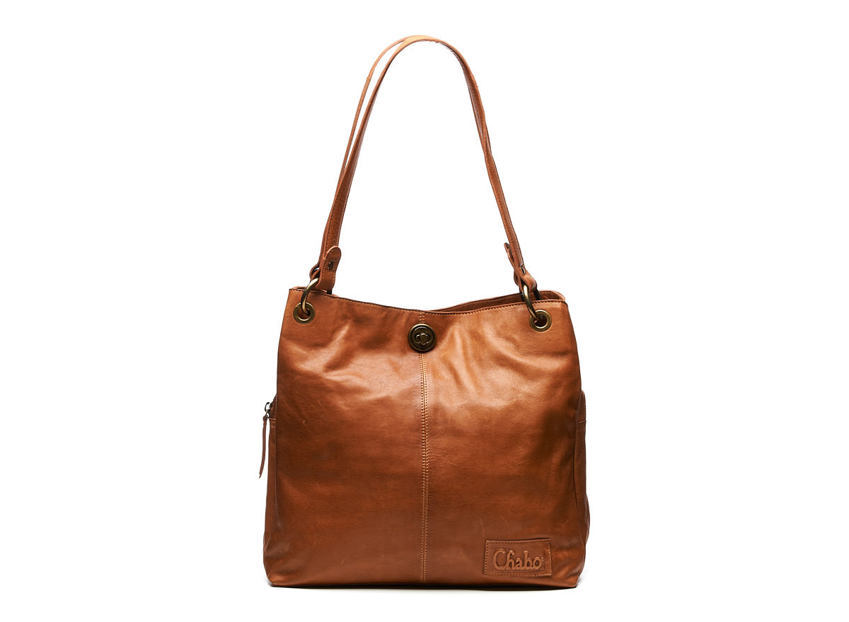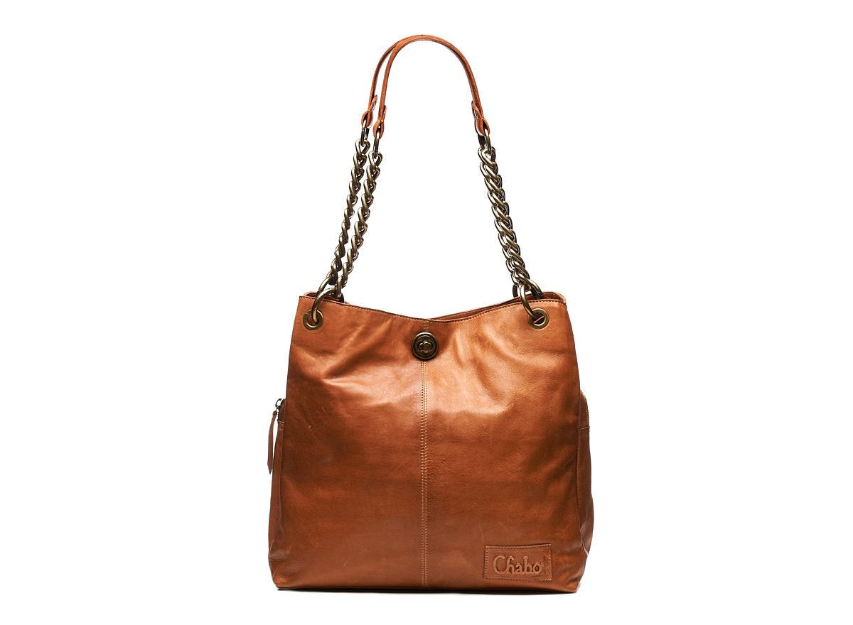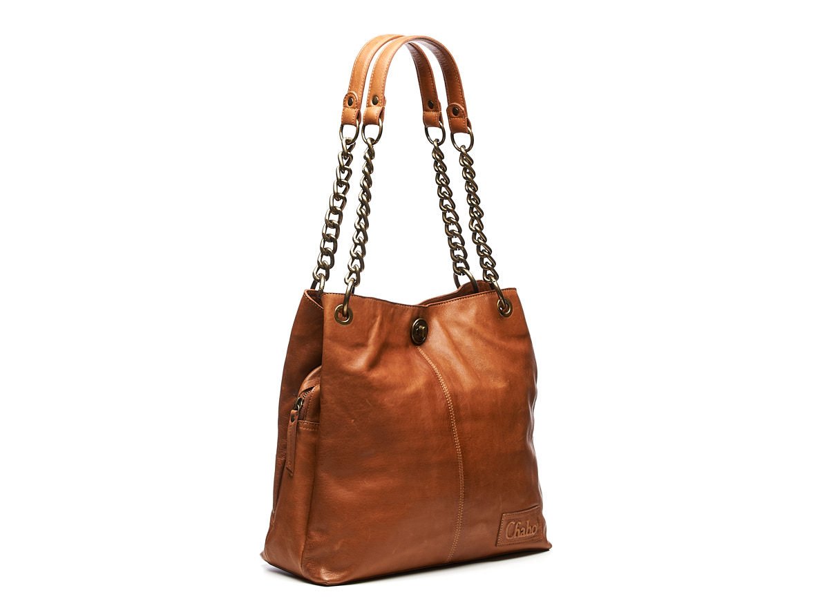 Deze schoudertas valt op door de antique brass schakel-schouderbanden, met draaisluiting. Wil je eens iets anders dan antique brass? De schoudertas wordt geleverd met twee extra effen leren schouderbanden, zodat je kunt wisselen!